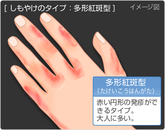 ・指に点々と赤いぶつぶつや小さな腫れができる(大人に多いタイプ)